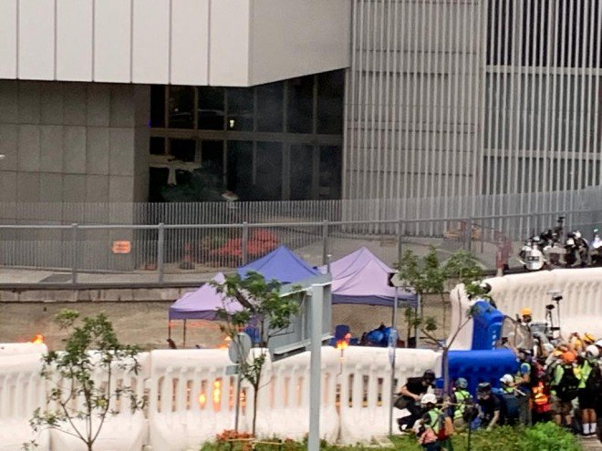 #LIVE: More petrol bombs have been thrown by protesters on Tim Wa Avenue, near the government complex, causing a fire. Police have responded with tear gas. http://sc.mp/3nrqw #hongkongprotestspic.twitter.com/iAjnT6mGvc