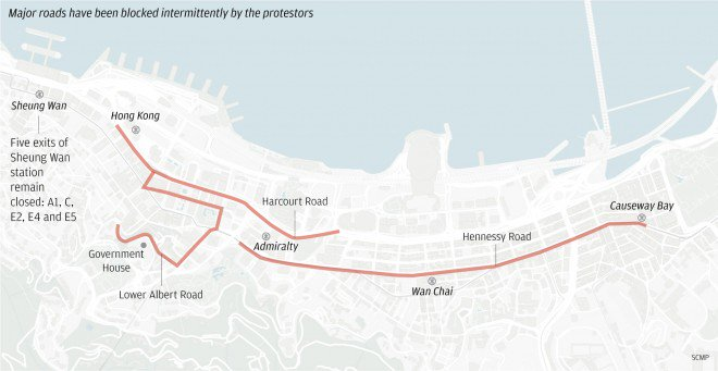 #LIVE: Major roads on Hong Kong Island have been blocked intermittently with heavy traffic jams expected across the island. Affected areas include Sai Ying Pun, Central, Admiralty, Wan Chai and Causeway Bay. http://sc.mp/3nrqw  #hongkongprotestspic.twitter.com/YWf2cX2HbD