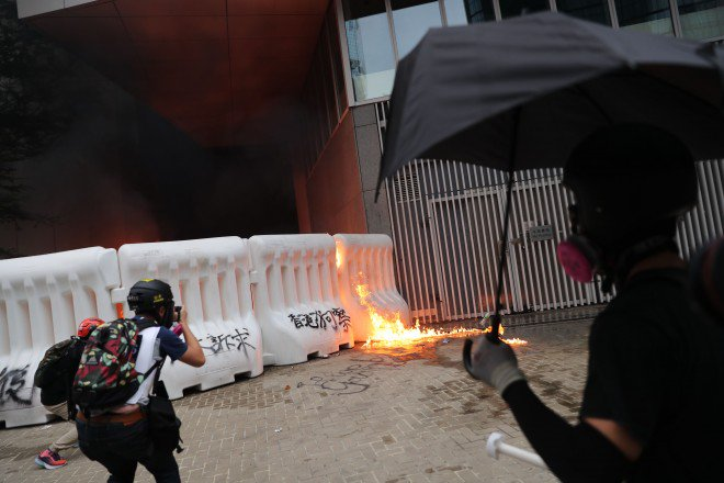 #LIVE: At least four petrol bombs have been thrown as riot police march towards protesters on Hennessy Road. Police responded with tear gas.
