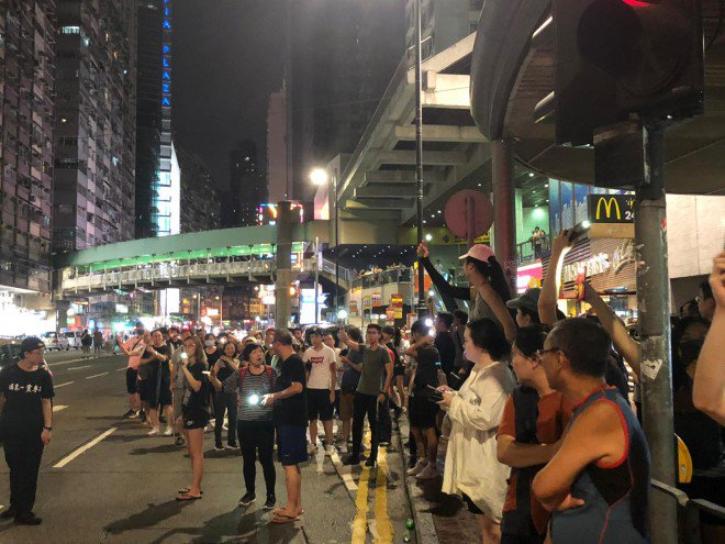 #LIVE: On King's Road in Fortress Hill, residents are chanting the slogan,"Liberate Hong Kong, revolution of our times" and lighting up their cell phone torches. http://sc.mp/3nrqw #hongkongprotestspic.twitter.com/zuhVImyT6j