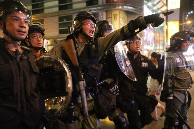 #LIVE: Officers at Mong Kok Police Station have raised a blue flag, warning of the use of force after protesters threw missiles http://sc.mp/3nrqw #hongkongprotests