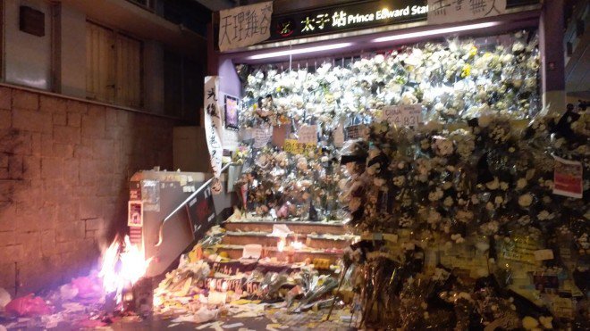 #LIVE: Outside the Prince Edward MTR station exit which is adorned with flowers, a small fire has been started http://sc.mp/9ni0n#HongKongProtestspic.twitter.com/e5UC2uchyo