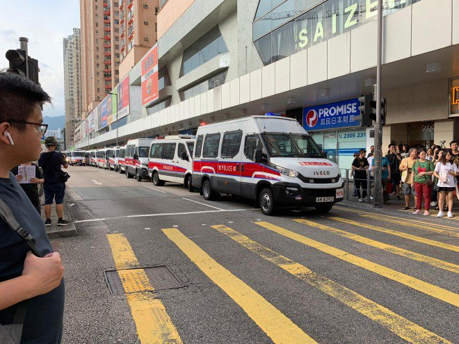 #LIVE: Residents are keeping an eye on a line of at least 20 police vans outside Amoy Plaza. The crowd has started singing Glory to Hong Kong, a popular protest anthem. https://sc.mp/y4ze8 #hongkongprotestspic.twitter.com/4mc1GPrLLX