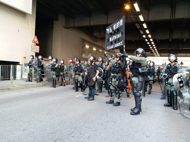 #LIVE: Police have raised the black warning flag, which means they will use tear gas if the crowd does not disperse. https://sc.mp/2j94d #hongkongprotestspic.twitter.com/YdDhfGZMw7
