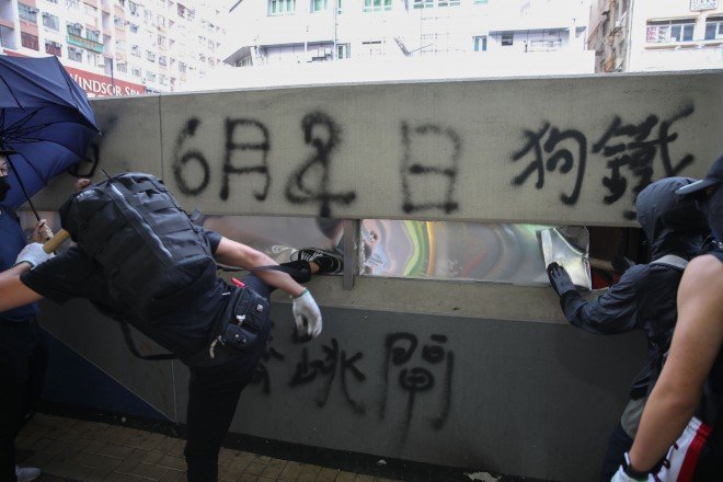 #LIVE: A group of protesters has vandalised an exit of Yau Ma Tei station, spray-painting it and smashing windows http://sc.mp/n2lno pic.twitter.com/qZtRpmVKHt