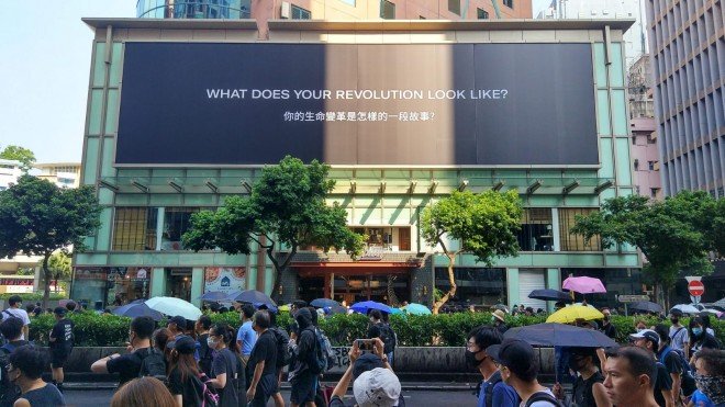 #LIVE: The march passes a banner at the Eaton Hotel which, given the recent protest movement's revolutionary themes, seems apt http://sc.mp/n2lno pic.twitter.com/xJ1W9jeY0Y