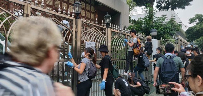 #LIVE: Several police representatives, including Ho Yun-sing, Yau Tsim district commander, have entered Kowloon Mosque. The entrance and front gate of the building was earlier splashed with blue dye from a police water cannon http://sc.mp/n2lno  #HongKongProtests