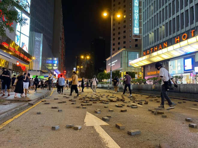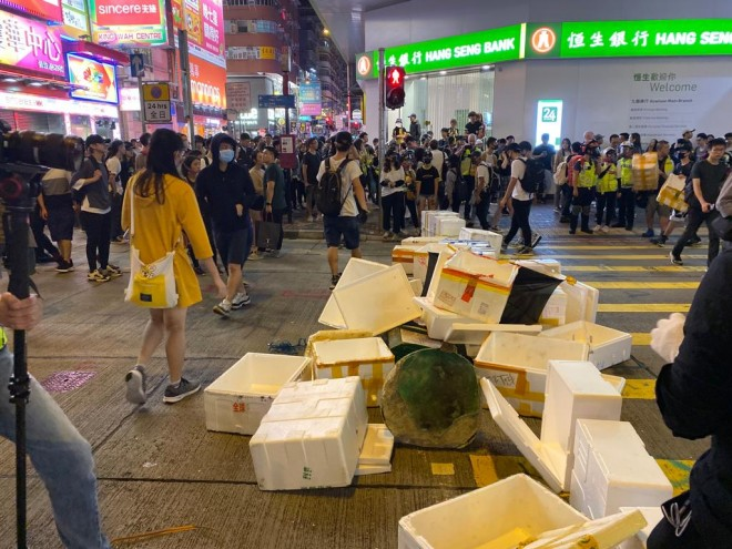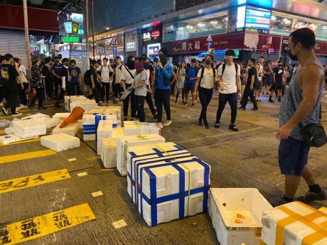 #LIVE: Protesters have strewn foam boxes on roads in Mong Kok, at the junction of Nathan Road and Shan Tung Road. https://sc.mp/xxhnx #hongkongprotestspic.twitter.com/uBNy44QV2n