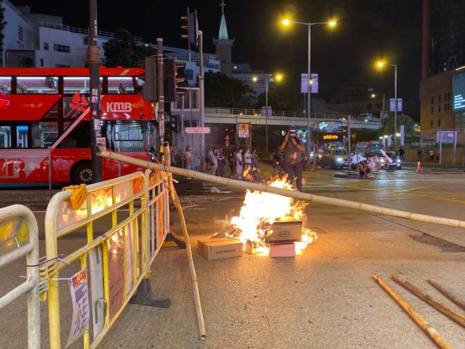 #LIVE: In Mong Kok, where clashes are now mostly centred, a roadblock is set on fire by protesters. Special tactical squad officers known as the raptors then swoop in to disperse the crowd at the junction. https://sc.mp/xxhnx #hongkongprotestspic.twitter.com/pQuNFdzcq5