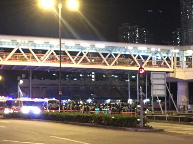 #LIVE: Riot police arrive outside a car park in Tseung Kwan O, where student Chow Tsz-lok was reported to have fallen on Monday. They clear barricades on roads, raising the blue flag at crowds who have gathered there, warning them of an illegal assemblyhttp://sc.mp/rijgc