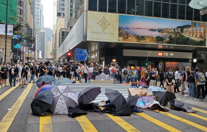 #LIVE: Dozens of protesters are shifting around in Central chanting “Liberate Hong Kong; revolution of our times” after building complex roadblocks with bricks, bamboo and shattered glass http://sc.mp/k5fad  #hongkongprotestspic.twitter.com/M2Hjg58WTt