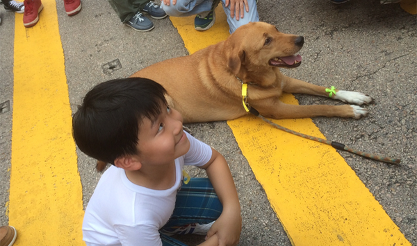 「”噛まないから大丈夫、梁振英以外はね” と親が子供に モンコックにて」※黄色いリボンでおめかしの"民主犬”。(梁氏は香港トップの行政長官)#香港デモ RT