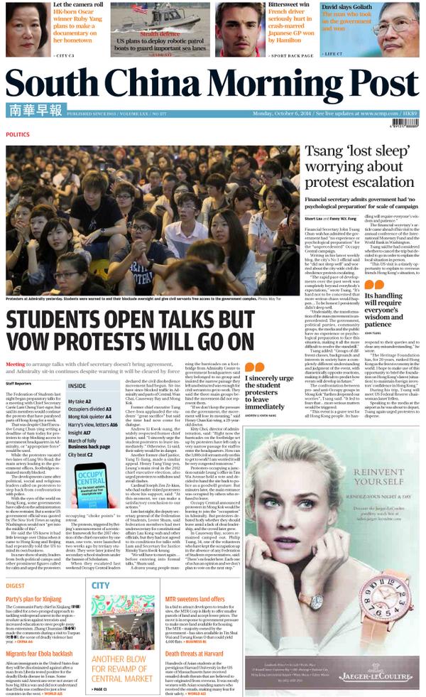 Our front page for Monday, October 6, 2014. Read our top stories here: http://scmp.com pic.twitter.com/pPC0vUpGJF