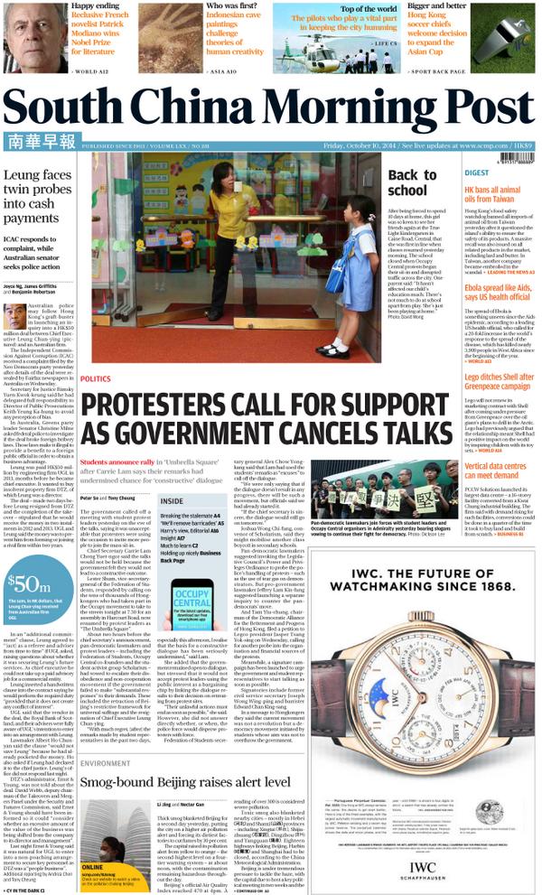 Our front page for Friday, October 10, 2014. Read our top stories here: http://scmp.com pic.twitter.com/WQZcYQf4K2