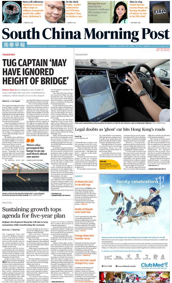 Tuesday's front pages of The South China Morning Post. To subscribe, find out more here: http://sc.mp/uod6l pic.twitter.com/0WaSkvIFba