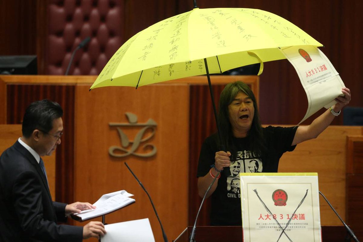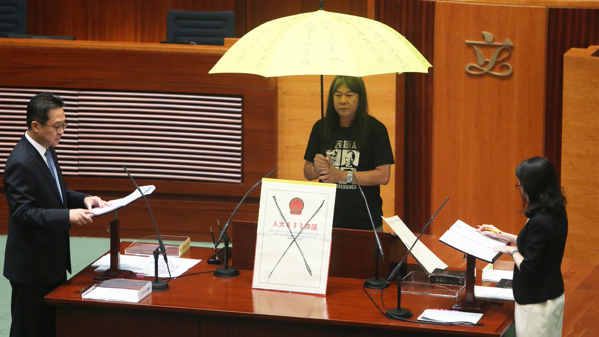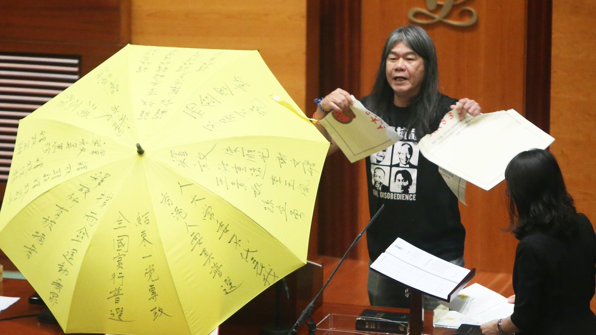 “Long Hair” Leung Kwok-hung, takes Legco oath with yellow umbrella – a symbol of 2014's #Occupy movement - and rips a prop copy of Basic Lawpic.twitter.com/lkPfpD0giM