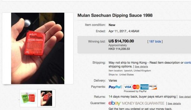.@McDonalds vintage ‘Sichuan sauce’ sold on eBay for US$14,700 http://buff.ly/2o93eRY pic.twitter.com/Em5KBzsZPj