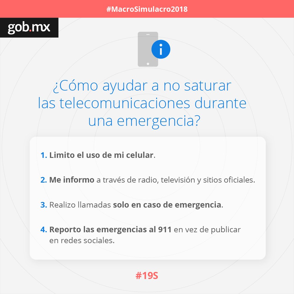 #NoOlvides que en casos de emergencia las #Telecomunicaciones pueden salvar vidas, contribuye a #NoSaturarlas.📱💻📺📻📶 #19S #FuerzaMéxicopic.twitter.com/rNccyVsZYl