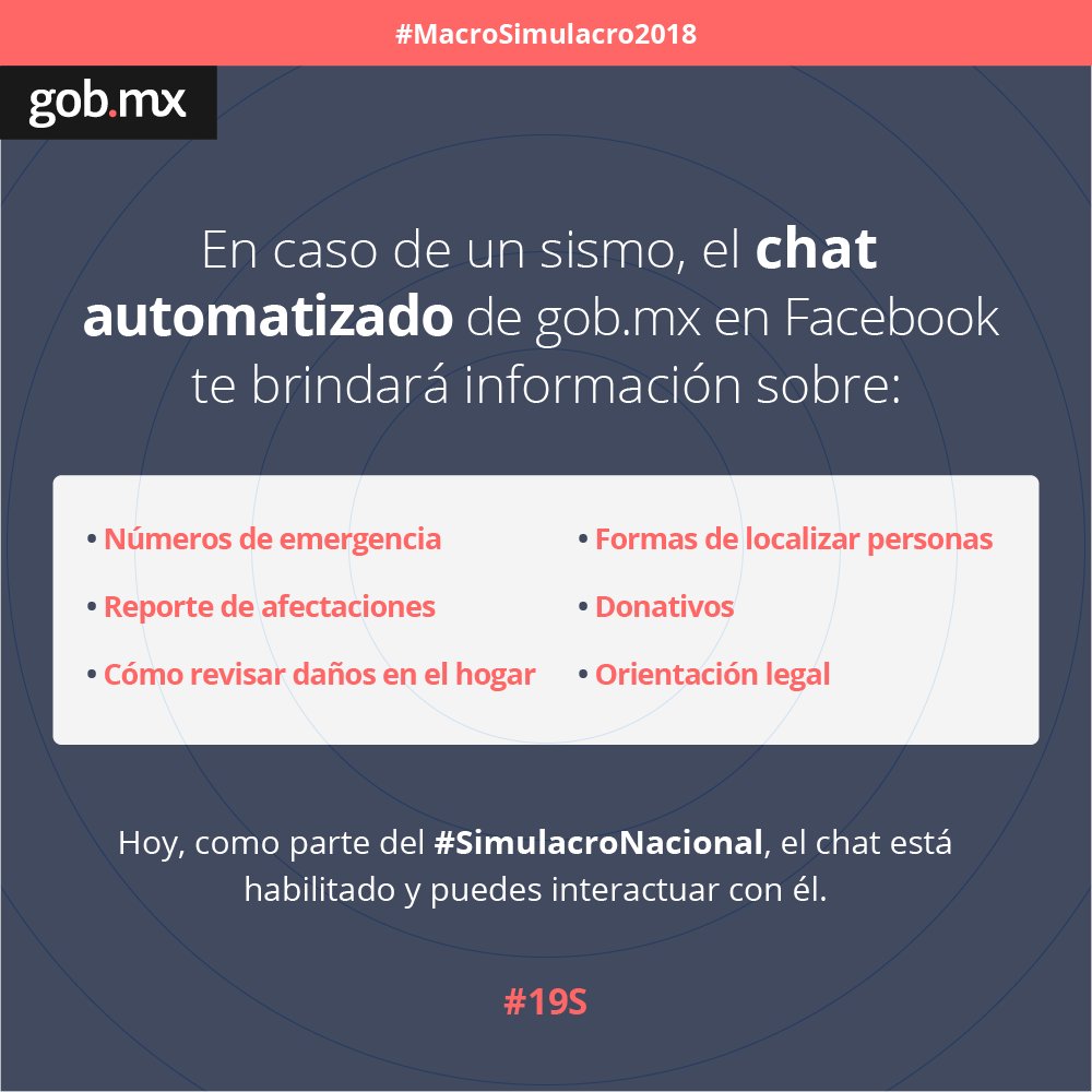 ¿Ya conoces el chat automatizado de http://gob.mx en #Facebook? Hoy, como parte del #SimulacroNacional puedes interactuar con él y ver cómo funciona en caso de sismo.