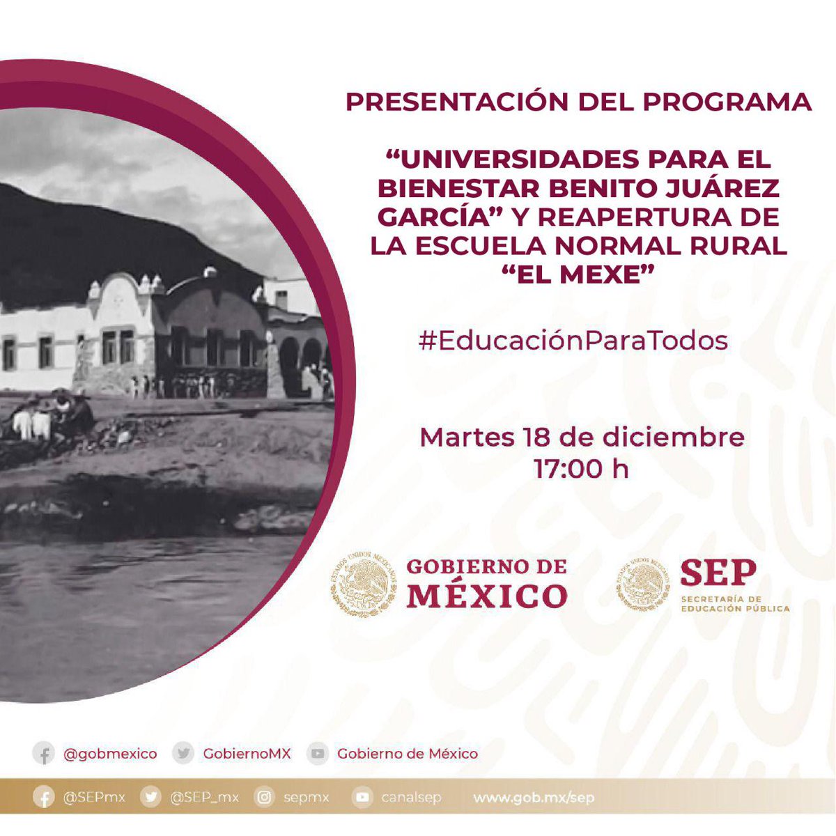 🔴En unos momentos desde el estado de #Hidalgo, el Presidente @lopezobrador_ y la @SEP_mx presentarán el Programa “Universidades para el Bienestar Benito Juárez García”, en el marco de la reapertura de la Escuela Normal Rural “El Mexe”. ▶#EducaciónParaTodospic.twitter.com/Ig41GJnw60