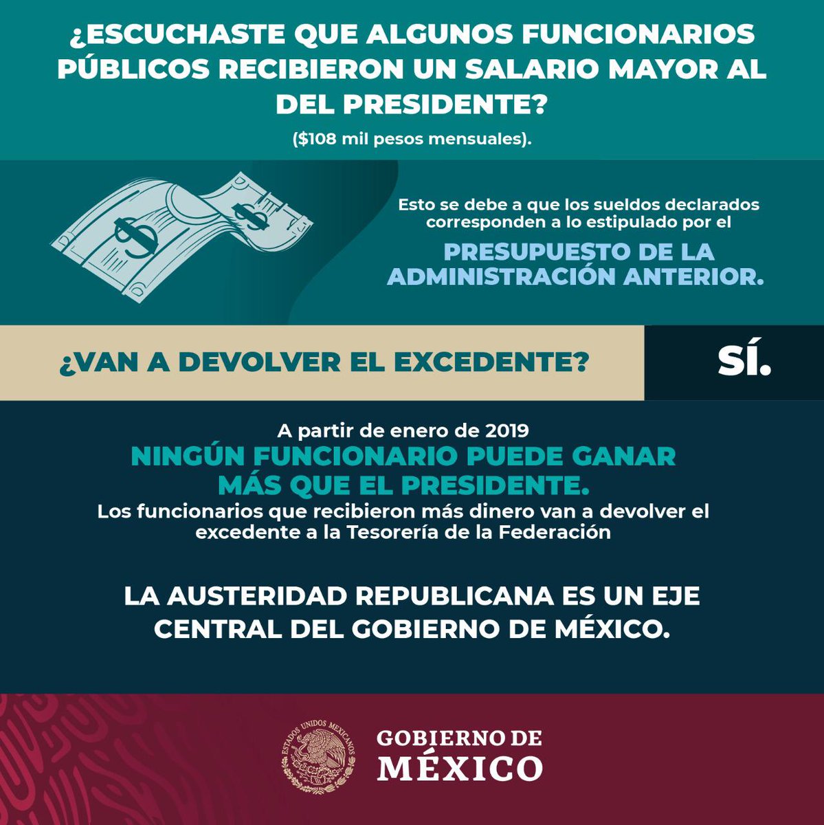 #Recuerda👇 La #AusteridadRepublicana es un eje central para el @GobiernoMX. A partir de enero de 2019 ningún funcionario puede ganar más que el #PresidenteDeMéxico. 🇲🇽pic.twitter.com/idCQjA7qmK