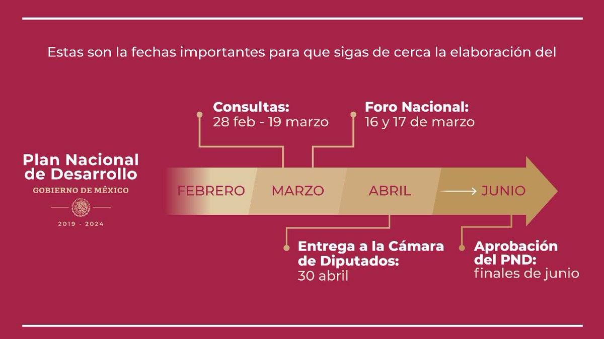 Sigue de cerca la elaboración del #PlanNacionalDeDesarrollo con las siguientes fechas y participa en la consulta digital a través de: ▶ http://www.planeandojuntos.gob.mx  ▶ http://www.planeandojuntas.gob.mx pic.twitter.com/szG4K9VlxU