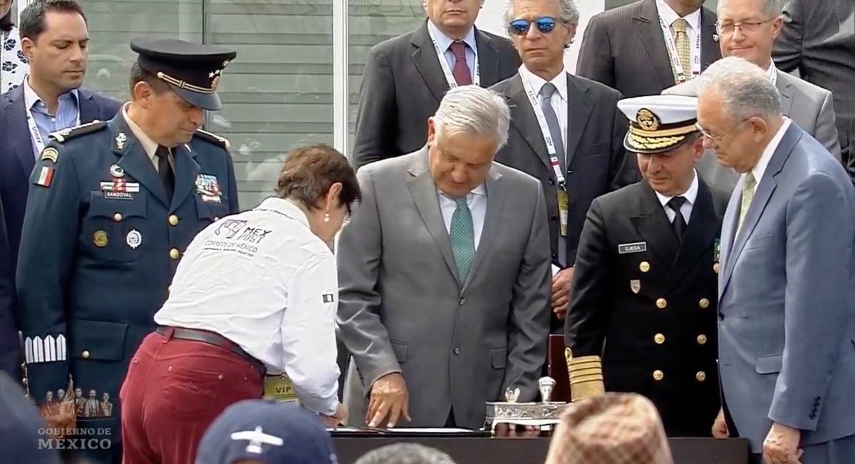 Momento en que el #PresidenteDeMéxico, acompañado del Secretario de Comunicaciones y Transportes @JimenezEspriu, canceló la estampilla postal de la #FAMEX2019