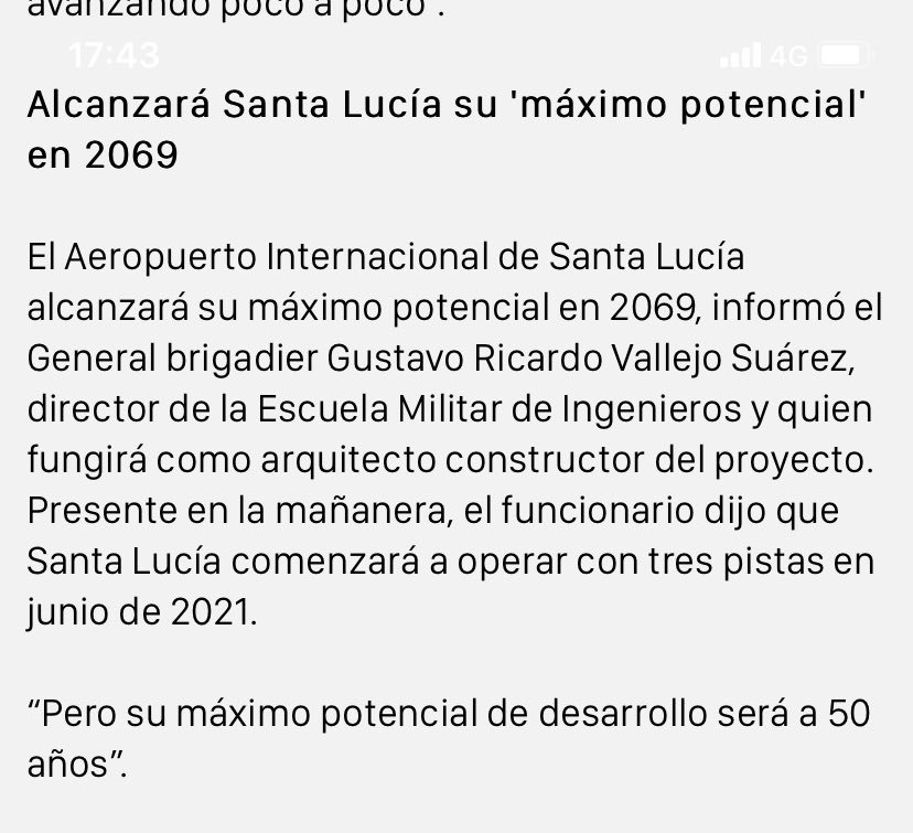 Tirar a la basura el NAIM que tendría capacidad de 70’millones de pasajeros al año un HUB de primer nivel, por una gansada que el encargado de la obra dice que estará a plenitud en 2069!!! Que vergüenza