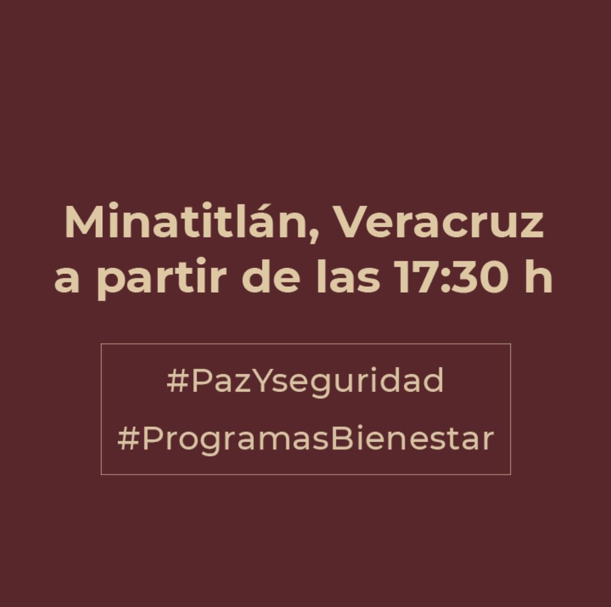 🔴 Esta tarde el #PresidenteDeMéxico @lopezobrador_ estará en Minatitlán, Veracruz — acompañado del gabinete de seguridad y la Sria. de @bienestarmx ☑ Entrega de #ProgramasBienestar ☑ Plan Nacional de #PazYSeguridad Sigue la transmisión #EnVivo | A partir de las 17:30 hrs. pic.twitter.com/6R1RiNS2zI