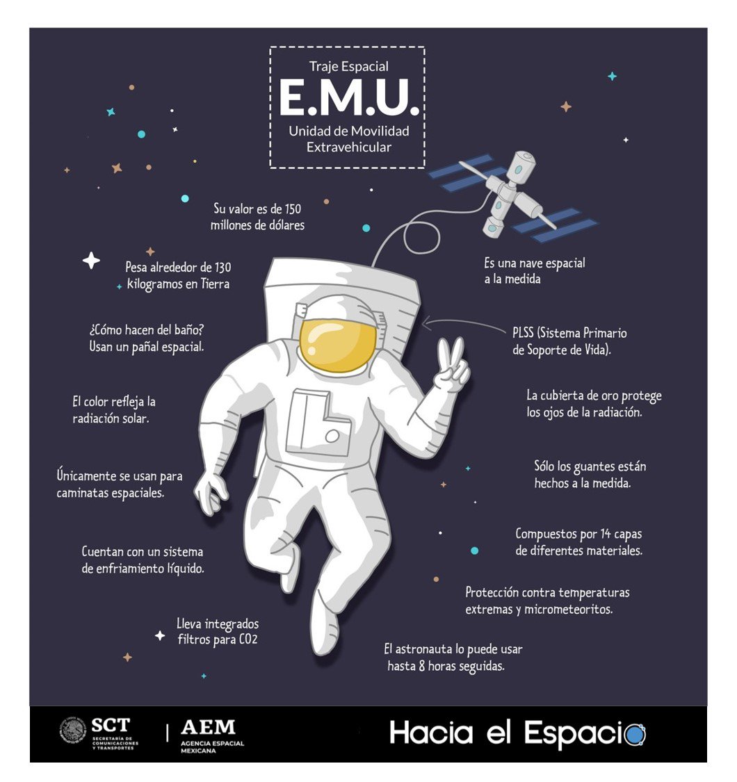 #TambiénSomosAEM @AEM_mx 🛰️🇲🇽 #Sabíasque❔❓El nombre formal del traje que utilizan los astronautas es: “Unidad de Movilidad Extravehicular” #EMU (sus siglas en inglés). 👩‍🚀👨‍🚀 ¿Quieres saber más? #Entérate en la siguiente #InfografíaAEMpic.twitter.com/rtNqUtdCIi