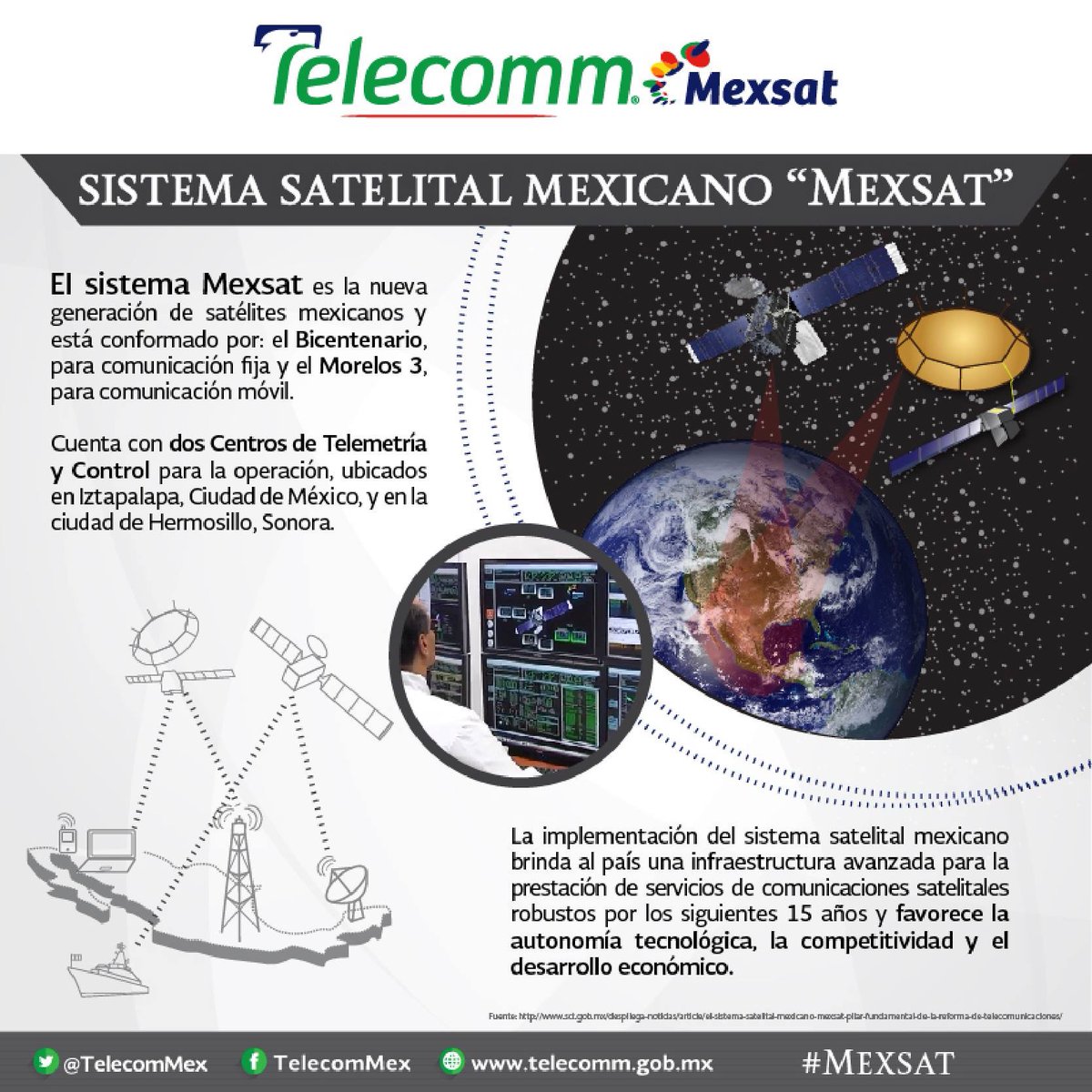 El Sistema Satelital Mexicano “Mexsat” está conformado por dos satélites: El “Bicentenario” para comunicación fija, y el “Morelos 3” para comunicación móvil.
