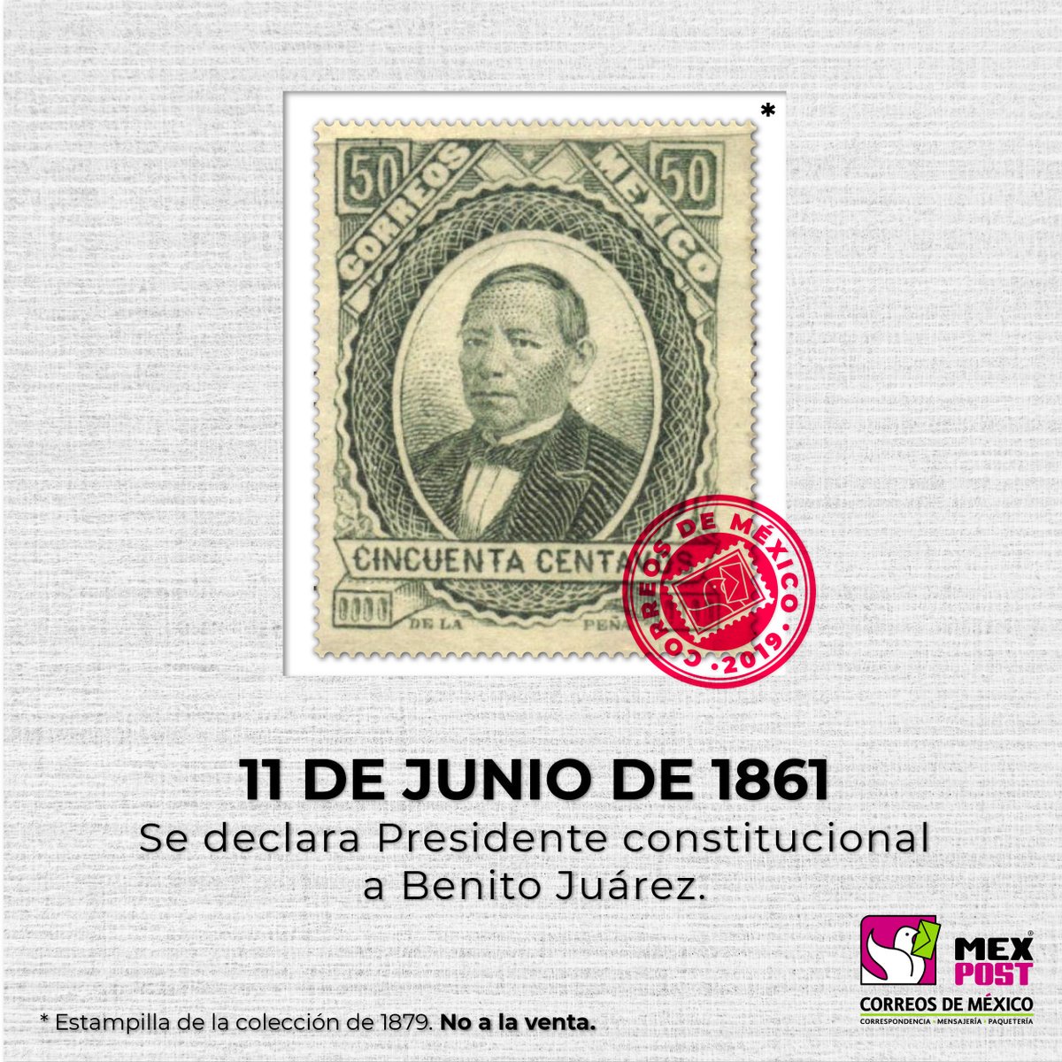 ¿Viste el timbre postal con el que #Sepomex @CorreosDeMexico recordó el 11 de junio de 1861, día en que Benito Juárez fue declarado Presidente Constitucional de la República Mexicana?