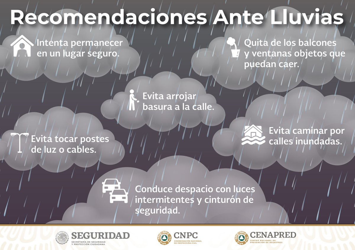 En esta temporada de lluvias, toma en cuenta las recomendaciones que Protección Civil @CNPC_MX tiene para ti.