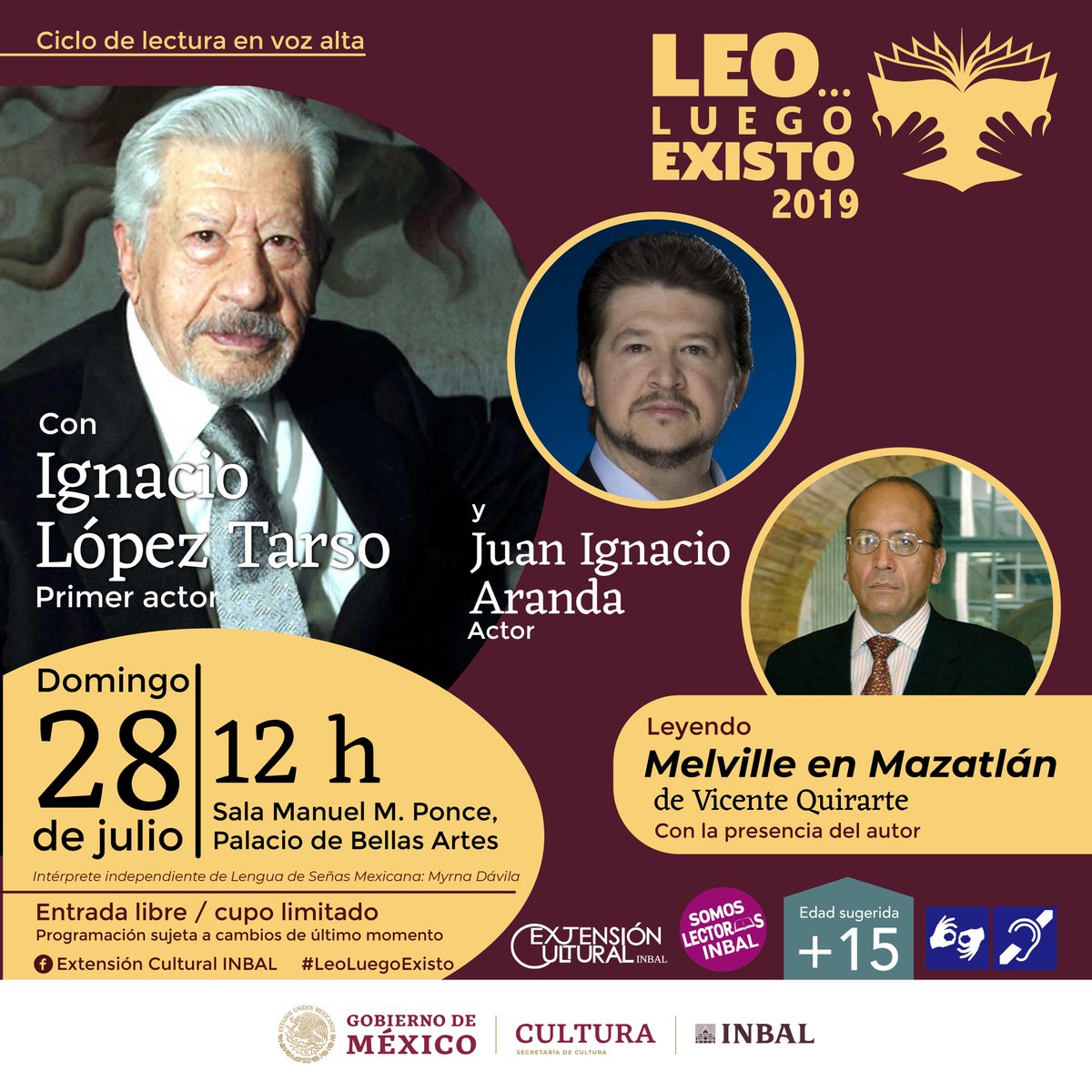 Imagina el encuentro de Herman Melvile de 24 años con él mismo, pero de 60 años. 🤔‼ En el marco del #CicloLeoLuegoExisto, los actores Ignacio López Tarso y Juan Aranda, leerán esta historia escrita por Vicente Quirarte. Te invitamos al Palacio de Bellas Artes @PalacioOficial.pic.twitter.com/xPToKYvtLo