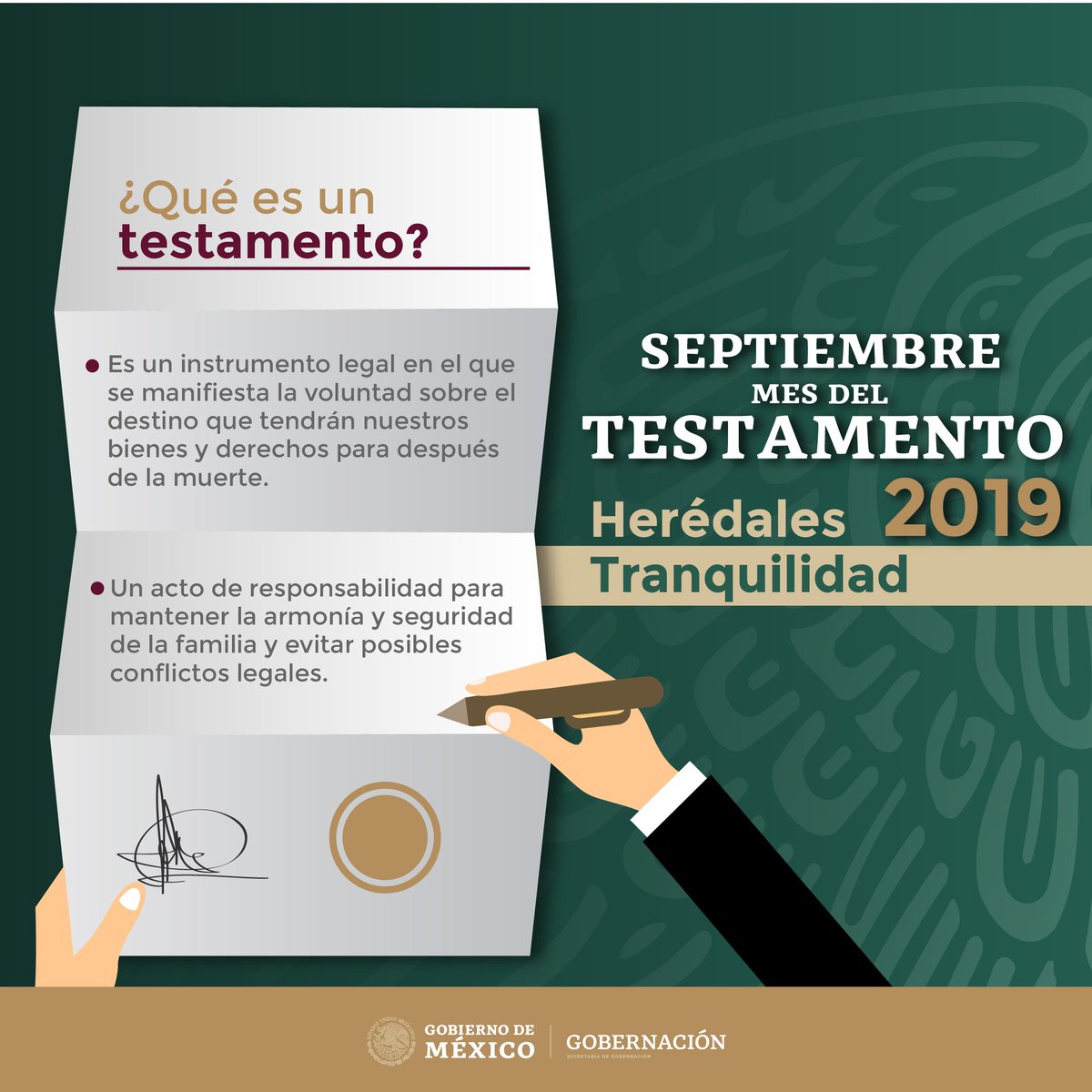 #Recuerda Se acerca #Septiembre, #MesDelTestamento, herédale tranquilidad a tus seres queridos. Infórmate en 👉 https://gob.mx/testamento pic.twitter.com/Y2bF7d5OKB