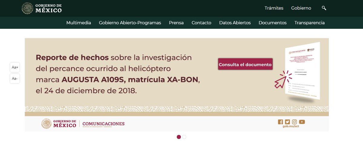 Entra a nuestro portal http://www.gob.mx/sct , y descarga el Reporte de hechos sobre la investigación del percance ocurrido al helicóptero marca Augusta A109S, matrícula XA-BON el 24/12/2018.