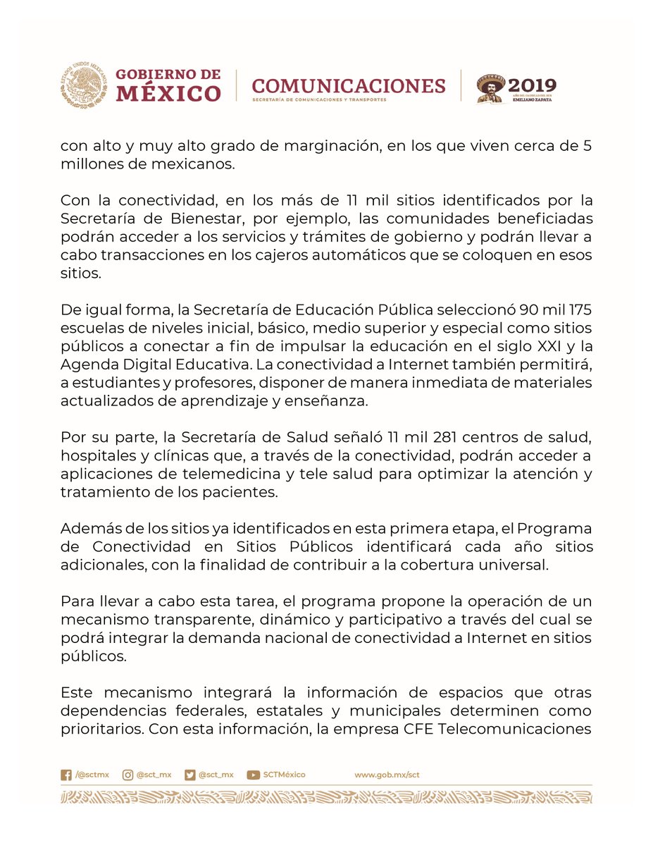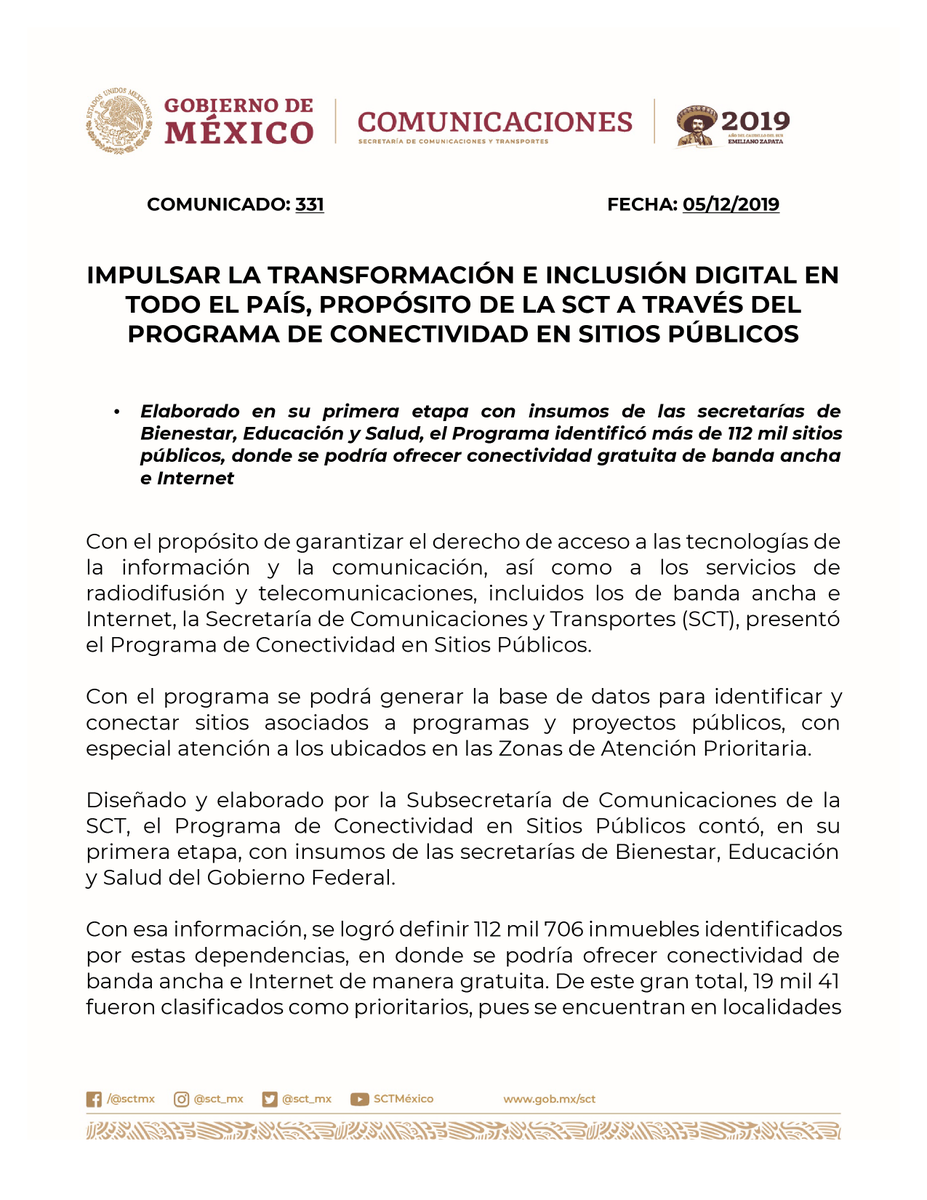 #ComunicadoSCT Impulsar la transformación e inclusión digital en todo el país, propósito de la #SCT a través del Programa de Conectividad en Sitios Públicos. ➡️ https://bit.ly/33WoCP4 pic.twitter.com/RjDLId5bHf