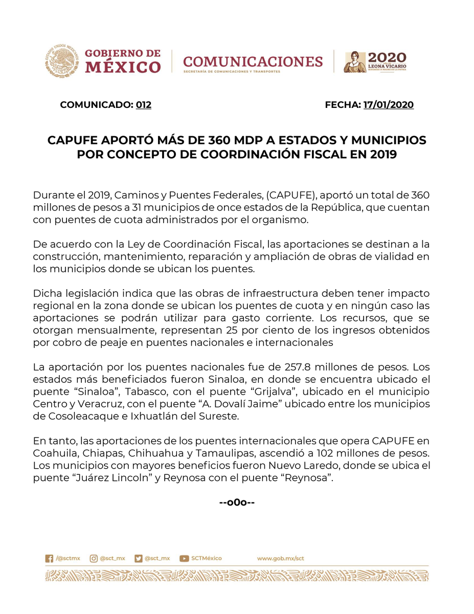 https://www.gob.mx/sct/prensa/capufe-aporto-mas-de-360-mdp-a-estados-y-municipios-por-concepto-de-coordinacion-fiscal-en-2019 …pic.twitter.com/mp7gPR7lCh