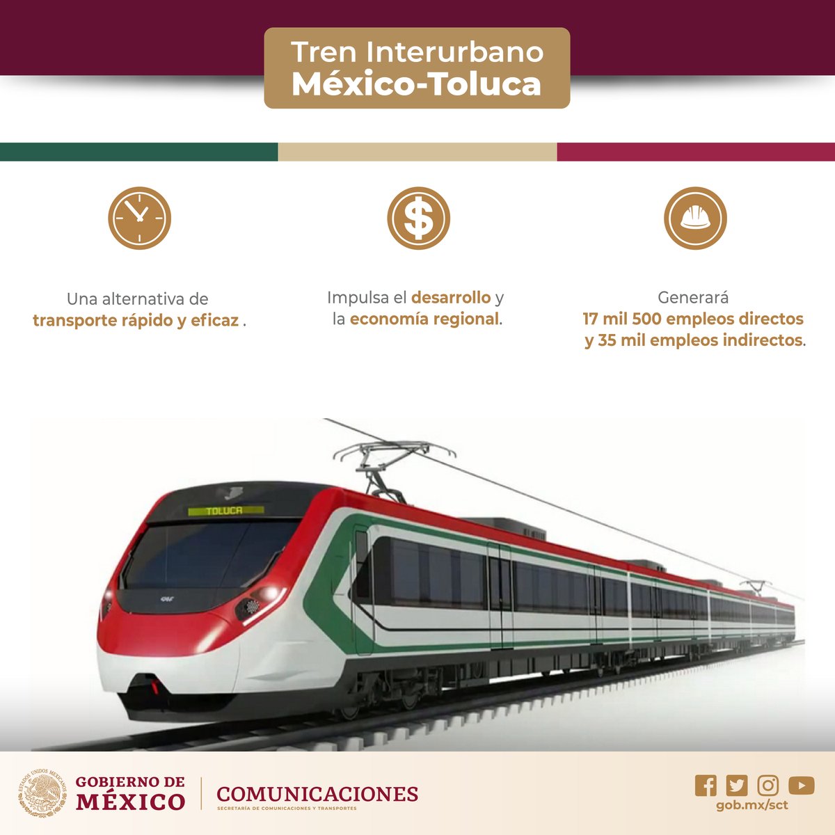 El Tren Interurbano México-Toluca impulsará el desarrollo y la economía regional, además de que generará, durante su construcción, 17 mil 500 empleos directos y 35 mil indirectos.