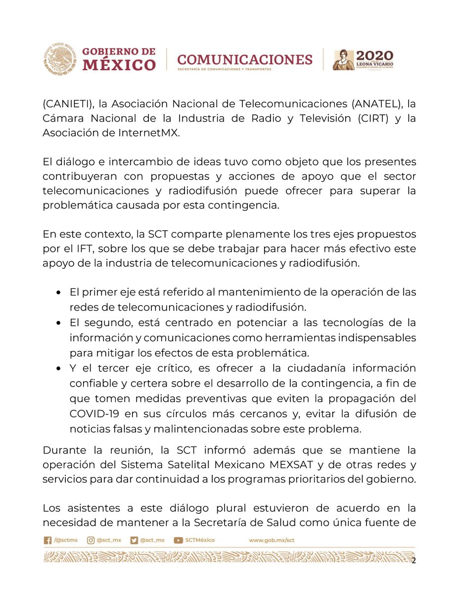 #ComunicadoSCT Sector de telecomunicaciones y radiodifusión comprometido con apoyo durante la contingencia de COVID-19. ➡️ https://bit.ly/2J2ddVW pic.twitter.com/SFnq5nzLT1