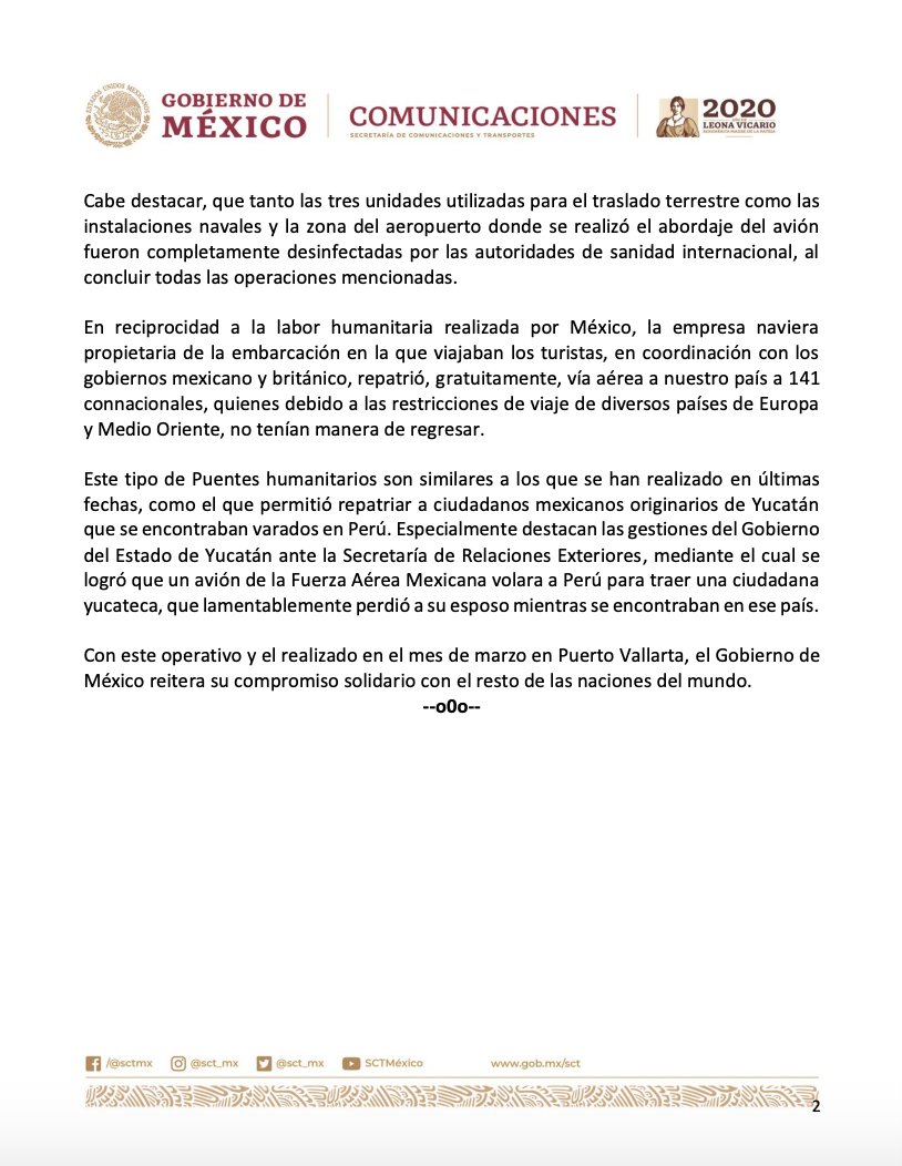 Entre el lunes y hoy, el Gobierno Federal y el de Yucatán llevaron a cabo un puente humanitario para desembarcar y repatriar en un charter, a 49 ingleses que llegaron en crucero a Progreso. En reciprocidad el avión trajo a 141 compatriotas de Inglaterra.