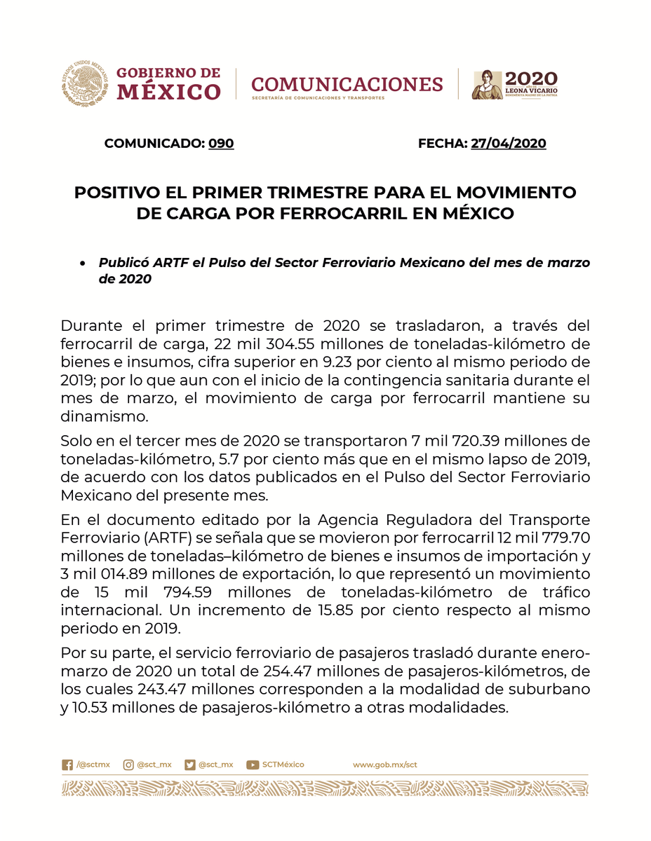 #ComunicadoSCT Positivo el primer trimestre para el movimiento de carga por #Ferrocarril en #México. ➡️ https://bit.ly/2YaKFm7 pic.twitter.com/kbjbuD4nX3