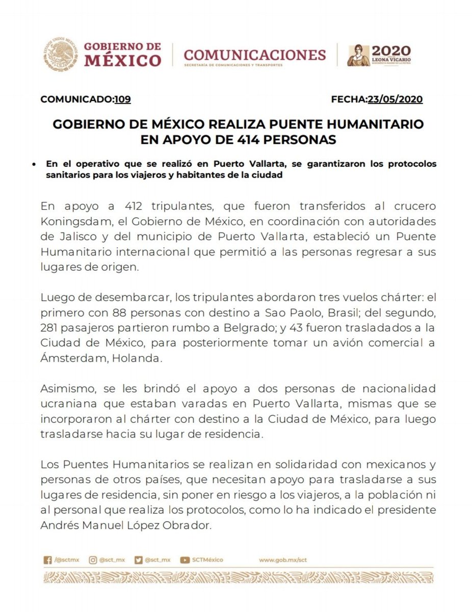 @GobiernoMX realiza puente humanitario en apoyo de 414 personas.
