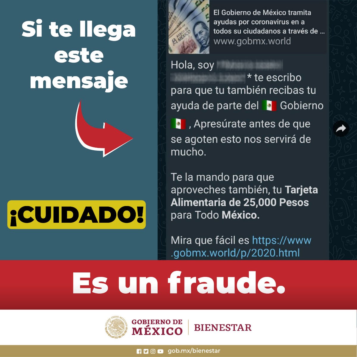¡Cuidado! #NoTeDejesEngañar Si te llegan mensajes ofreciendo dinero o apoyos del @GobiernoMX 🛑 Es un fraude 🛑 Infórmate a través de sitios de internet oficiales y redes sociales verificadas.pic.twitter.com/GeY3ll7eun