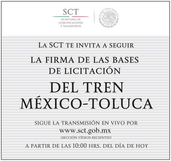La @SCT_mx te invita a seguir la firma de las bases de licitación del Tren #MéxicoToluca, 10h00 pic.twitter.com/4tEHMCgyi2 Vía @RMurrieta
