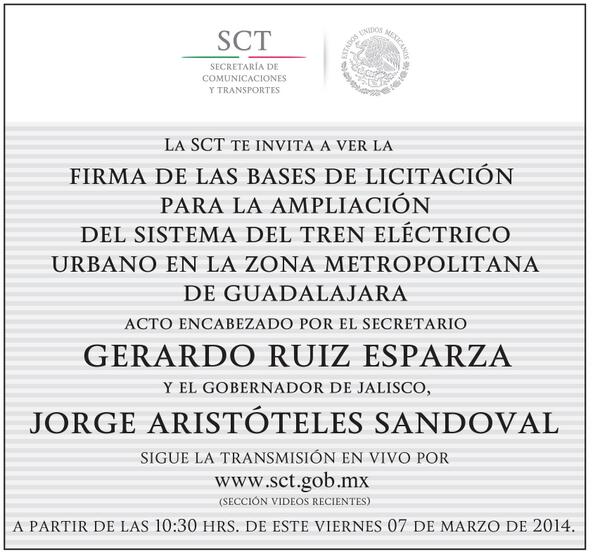 La SCT te invita a ver la Firma de las bases de licitación del Tren Eléctrico de Guadalajara, hoy 10:30 hrs.pic.twitter.com/K0hDraSC3o