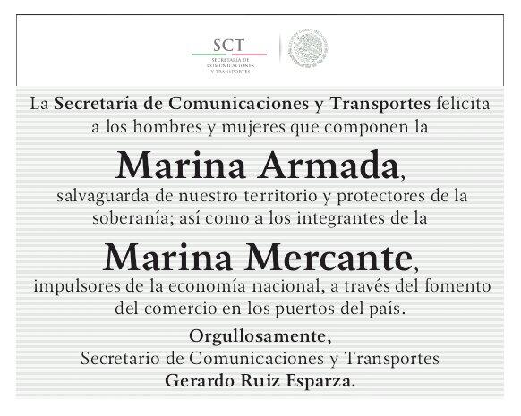 La @SCT_mx felicita a los hombres y mujeres que componen la Marina Armada y la Marina Mercante: @gruizesppic.twitter.com/8AEfLbMpm6