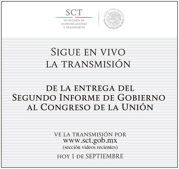 Sigue #EnVivo la entrega del #SegundoInforme de Gobierno en: http://www.sct.gob.mx/ pic.twitter.com/nExmHWPWRq