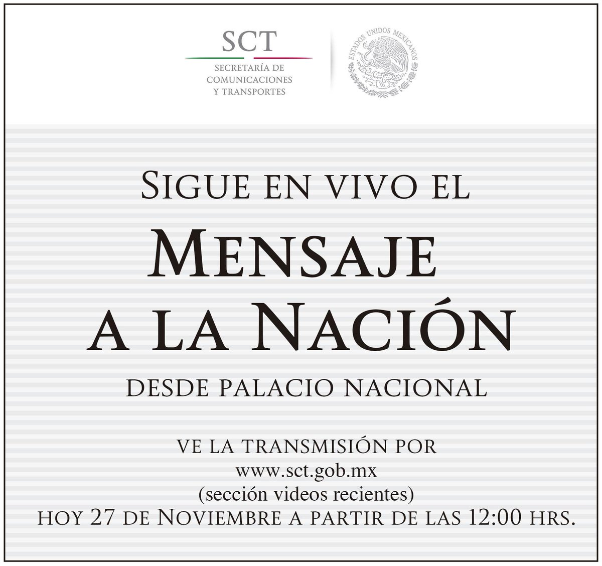 Sigue #EnVivo el mensaje a la Nación, transmitido desde Palacio Nacional, sigue el evento en http://sct.gob.mx pic.twitter.com/x4LdBnmZzT