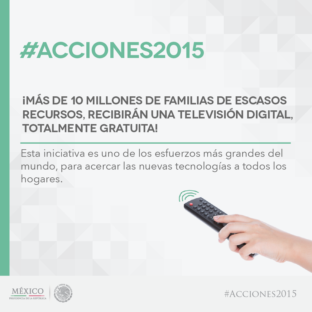 En 2015 más de 10 millones de familias de escasos recursos, recibirán una tv digital, totalmente gratuita: @EPNpic.twitter.com/71YeXMYqSE